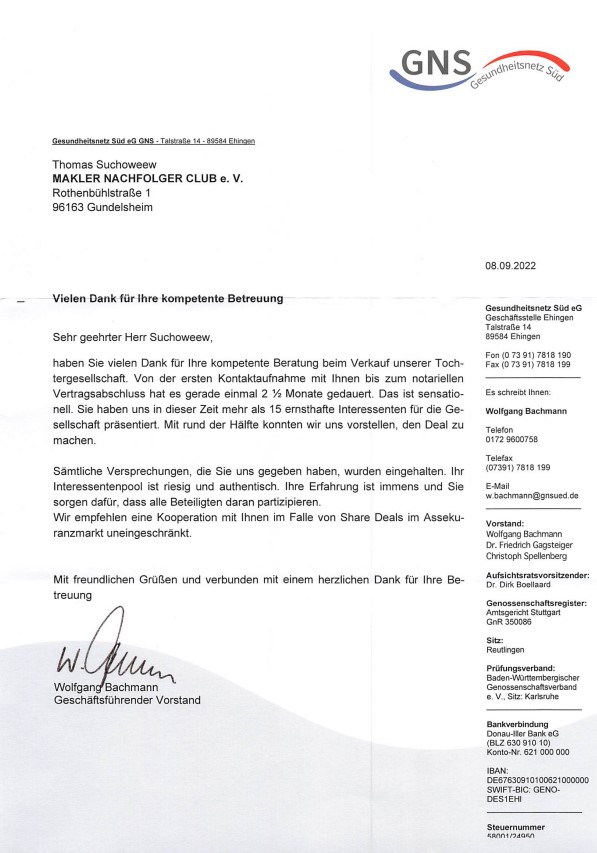 Zur Vorbereitung seines Vorhabens vereinbarte er ein Gespräch mit der Unternehmensberatung Suchoweew Consulting GmbH&Co.KG in dem ein klares Anforderungsprofil mit Übernahmestrategie an das zu übernehmende Maklerunternehmen erstellt wurde.
